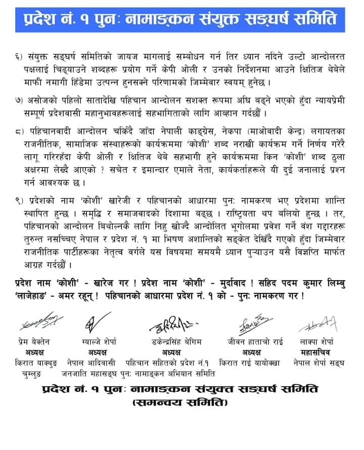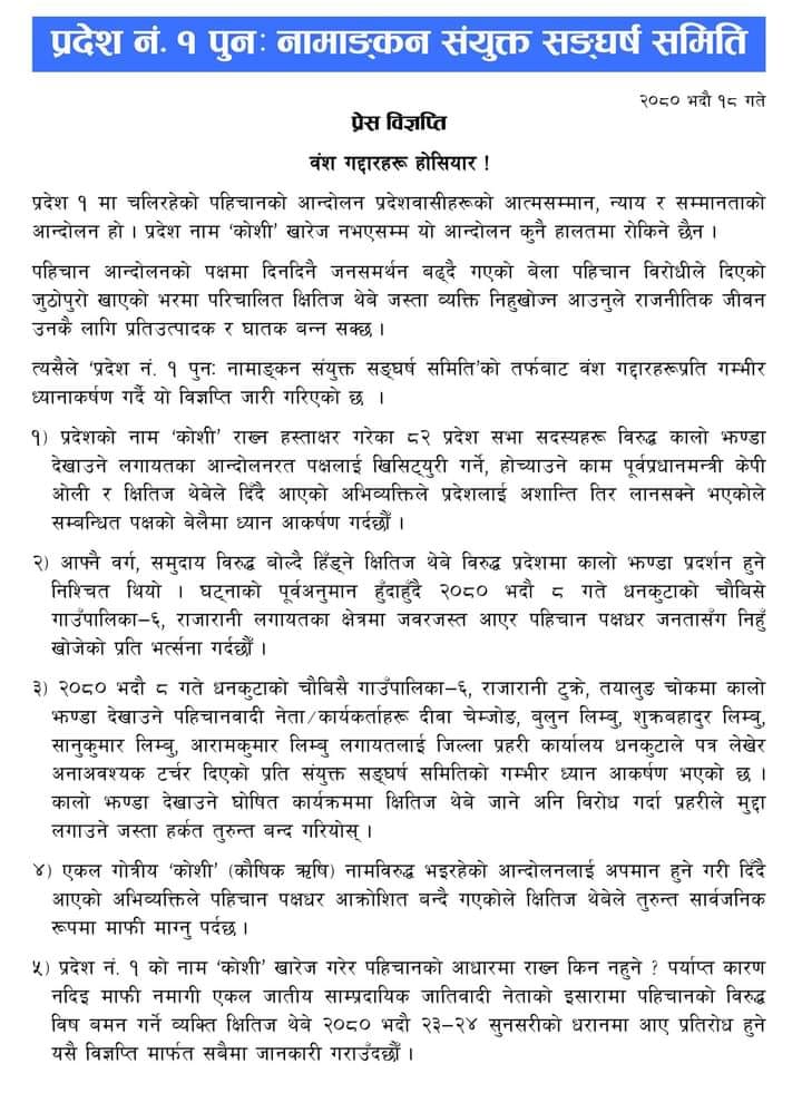प्रदेश नं १ पनः नामाङ्कन संयुुक्त संघर्ष समितिको तर्फबाट पहिचानको आन्दोलन वंश गद्दारहरू प्रति गम्भिर ध्यानाकर्षण भएको जानकारी गराउँदै आन्दोलनरत पक्षलाई पूर्व प्रधानमन्त्री खड्गप्रसाद ओली र क्षितिज थेबेले दिदै आएको अभिव्यक्तिले प्रदेशलाई अशान्त तिर लान सक्ने भएकोले सम्बन्धित पक्षले बेलैमा ध्यान दिन आग्रह गरेको छ ।