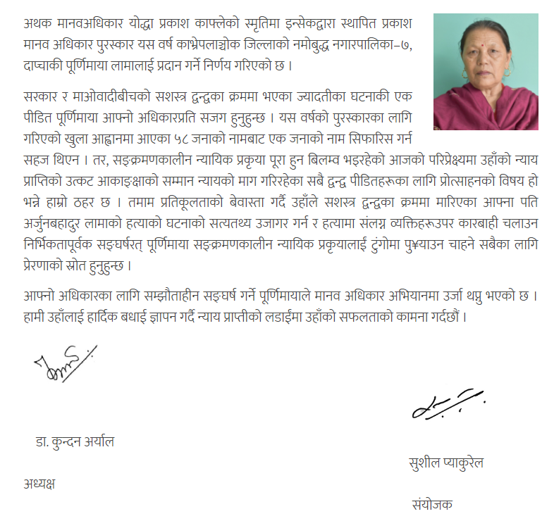यस वर्षको ३० औँ “प्रकाश मानव अधिकार पुरस्कार” काभ्रेपलान्चोक नमोबुद्ध नगरपालिका-९ दाप्चाकी ६२ वर्षीया पूर्णीमाया लामालाई प्रदान गर्ने अनौपचारिक क्षेत्र सेवा केन्द्र (इन्सेक) ले निणर्य गरेको छ ।