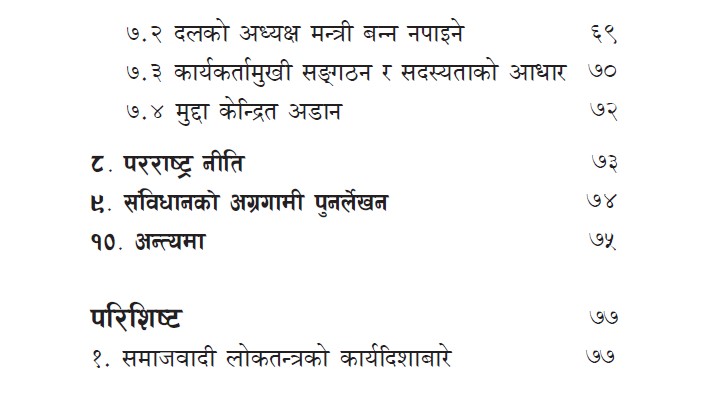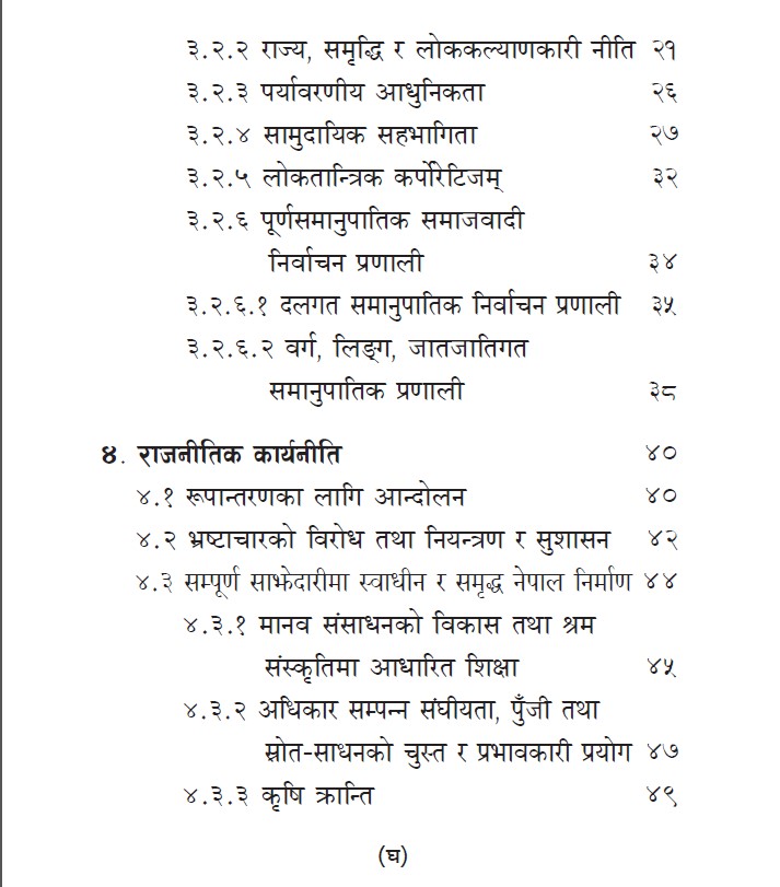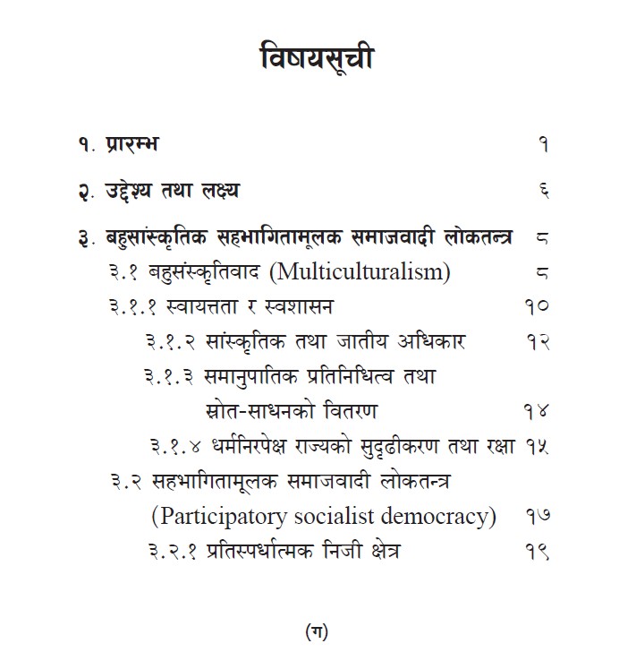 बहुसांस्कृतिवाद, स्वायत्तता र स्वशासन, सास्कृतिक तथा जातीय अधिकार समानुपातिक प्रतिनिधित्व र स्रोत साधनको वितरण, धर्म निरपेक्ष राज्यको सुदृढीकरण र रक्षा सहभागितामुलक समाजवादी लोकतन्त्र, प्रतिस्पर्धात्मक निजी क्षेत्र. राज्य समृद्धि र लोककल्याणकारी नीति पर्यावरणीय आधुनिकता, सामुदायिक सहभागिता, लोकतान्त्रिक कर्पोटेरिजम, पूर्ण समानुपातिक निर्वाचन प्रणाली, दलगत समानुपातिक निर्वाचन प्रणाली, वर्ग, लिङ्ग, जातिगत समानुपातिक प्रणाली लगायतको विषयमा मोर्चाको धारणा उल्लेख गरिएको छ ।