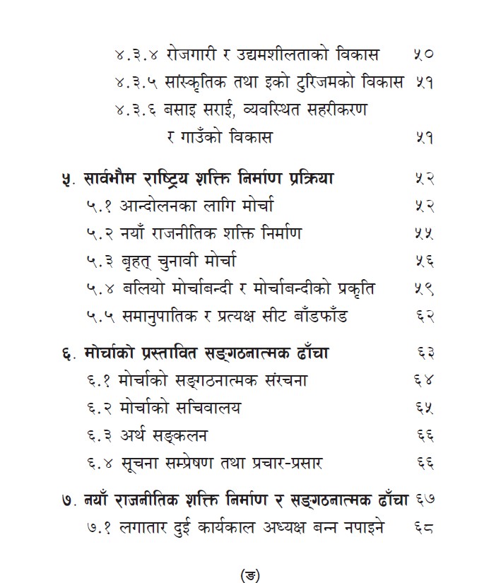 सार्वभौम राष्टिय शक्तिको निर्माण प्रक्रियामा आन्दोलनका लागि मोर्चा, नयाँ राजनीतिक शक्ति निर्माण, बृहद चुनावी मोर्चा, बलियो मोर्चाबन्दी र मोर्चाबन्दीको प्रकृतिमा समानुपातिक र प्रत्यक्ष सीट बाँडफाँड प्रस्ताविक संगठनात्मक ढाँचाको विषयमा मोर्चाको धारणा उल्लेख गरेको छ ।