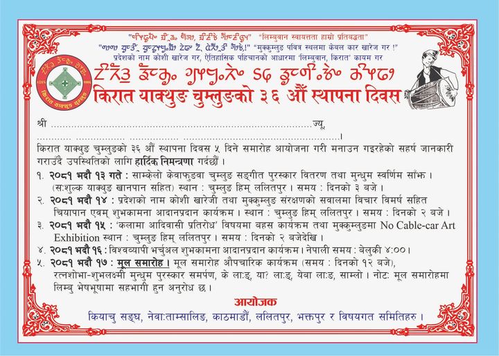 भदौ १५ गते कलामा आदिवासी प्रतरोध वषयमा बहस तथा मुक्कुमलुङ नो केवलकार कला प्रदर्शिनी कार्यक्रम गर्दै १६ गते विश्वव्यापी रुपमा भर्चुअल शुभकामना आदान प्रदान कार्यक्रम गरिने छ ।