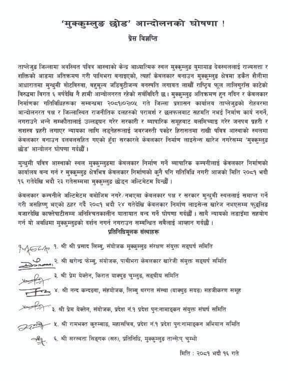 मुक्कुमलुङ अतिक्रमण हुन नदिन र केबुलकार निर्माणका गतिविधीका सम्बन्धमा गएको जेठ ५ गते जिल्ला प्रशासन कार्यालय ताप्लेजुङको रोहवरमा आन्दोलनरत पक्ष र जिल्लका राजनीतिक दलहरुको परामर्श र छलफल सहमती नभई निर्माण कार्य नगर्ने नगराउने भन्ने सम्झौतालाई उल्लंघन गरेर सरकारी र व्यापारी समूहबाट बलमिच्याई गरेर जनपद र शसस्त्र प्रहरी लगाएर न्यायका लागि लड्नेहरुलाई जबरजस्ती पक्रेर हिरासतमा राखी पवित्र आस्थाको स्थलमा केबुकार बनाउन दलबल सहित गएको हुँदा सरकारले केबुलकार निर्माण लाइसेन्स खारेज नगरेसम्म मुक्कुलुङ छोड आन्दोलन घोषणा गर्दछौं विज्ञप्तीमा भनिएको छ ।