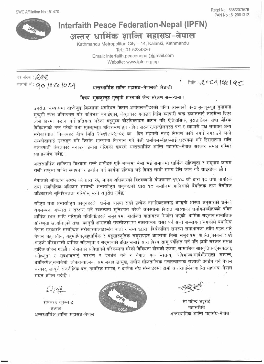 अन्तर धार्मिक शान्ति महासंघ नेपालले मंगलबार विज्ञप्ति जारी गर्दै मुक्कुमलुङ क्षेत्रमा जबरजस्ती केबुलकार बनाउन खोजिएको विषयमा गम्भिर ध्यानाकर्षण भएको जनाएको छ ।