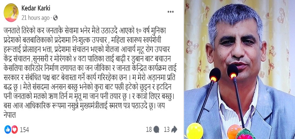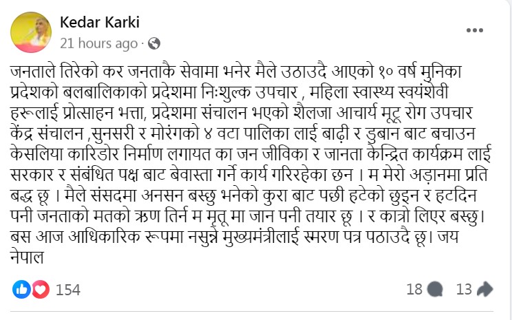 सामाजिक सञ्जाल फेसबुकमा आइतबार बिहान स्टाटस लेख्दै उनले १० वर्ष मुनिका प्रदेशको बालबालिकाको प्रदेशमा निःशुल्क उपचार, महिला स्वास्थ्य स्वयम् सेवीहरूलाई प्रोत्साहन भत्ता, प्रदेशमा सञ्चालन भएको शैलजा आचार्य मुटु रोग उपचार केन्द्र सञ्चालन, सुनसरी र मोरङको ४ वटा पालिकालाई बाढी र डुबानबाट बचाउन केसलिया कारिडोर निर्माण हुनुपर्ने अडान पुनः राखेका हुन् ।