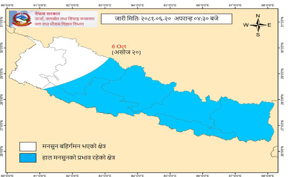 सुदूरपश्चिम र कर्णाली प्रदेशका धेरै ठाउँ तथा लुम्बिनी प्रदेशका केही ठाउँबाट मनसुन बाहिरिसकेको महाशाखाले जनाएको छ । मनसुनी वायु कमजोर हुँदै गइरहेकाले अब नेपालका अरू ठाउँबाट पनि मनसुन बिस्तारै बाहिरिने महाशाखाको भनाई छ ।