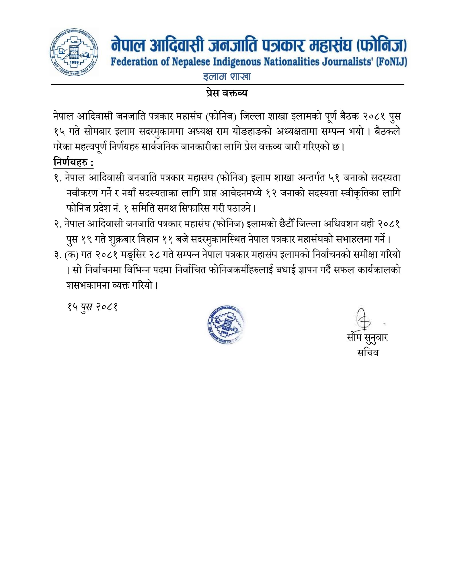 बैठकले गएको मङ्सिर २८ गते सम्पन्न नेपाल पत्रकार महासंघ इलामको निर्वाचनको समीक्षा गरी निर्वाचनमा विभिन्न पदमा निर्वाचित फोनिजकर्मीहरुलाई बधाई ज्ञापन गर्दै सफल कार्यकालको शसभकामना व्यक्त गरेको छ ।