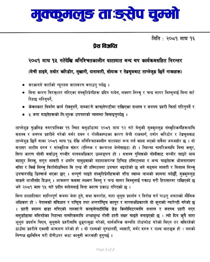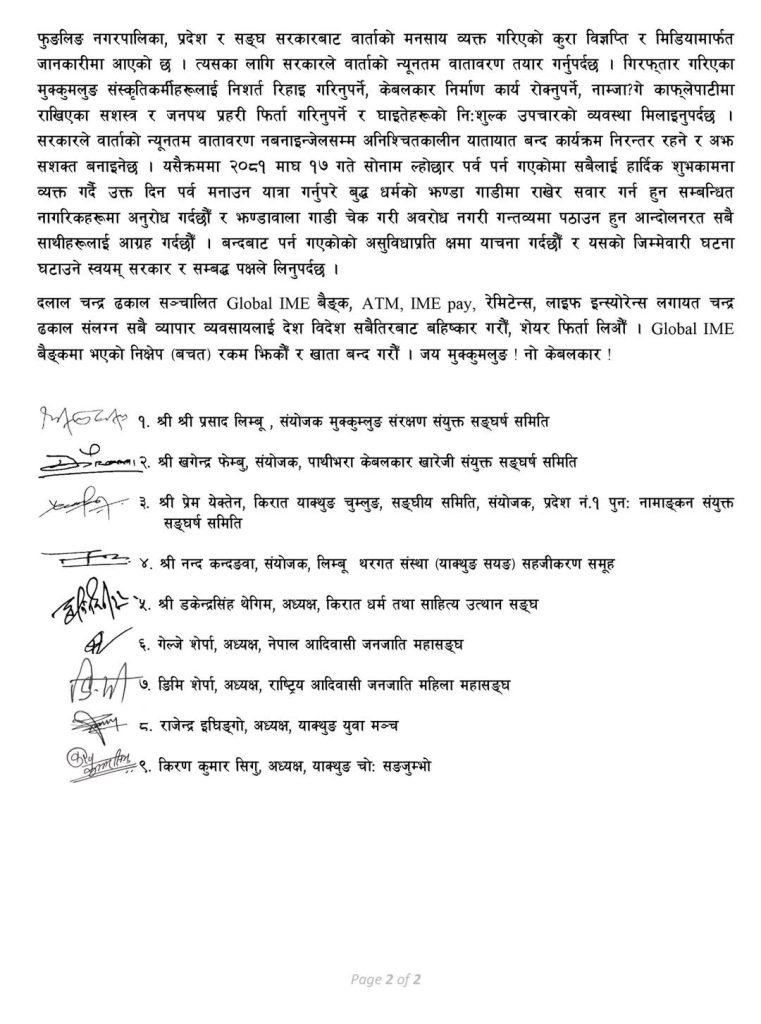 सरकारले वार्ताका लागि न्यूनतम वातावरण निर्माण गर्नुपर्ने । बिना कारण गिरफ्तार गरिएका प्रदिप मादेन लक्ष्मण लिम्बू र चन्द्रसागर लिम्बुलाई बिना सर्त रिहाई गर्नु पर्ने । केबुलकार निर्माण कार्य रोक्नु पर्ने नाम्जाङ्गे काफ्लेपाटीमा राखिएको सशस्त्र र जनपद प्रहरी फिर्ता गर्नु पर्ने । र ५ जना घाइतेको निशुल्क उपचारको व्यवस्था गर्नेपर्ने मुक्कुमलुङ ताङसेप चुम्भोमा आबद्ध मुक्कुमलुङ संयुक्त संघर्ष समिति संयोजक श्री प्रसाद लिम्बू, पाथीभरा केबलकार खारेजी संयुक्त संघर्ष समिति संयोजक खगेन्द्र फेम्बू, किरात याक्थुङ चुम्लुङ संघीय समिति प्रदेश नं १पुन: नामाङ्कन संयुक्त संघर्ष समिति संयोजक प्रेम येक्तेन, थरगत संस्था याक्थुङ सयङ सहजिकरण संयोजक नन्द कन्दङ्वा, किरात धर्म तथा साहित्य उत्थान संघ अध्यक्ष डकेन्द्रसिंह थेगिम, नेपाली आदिवासी जनजाति महासंघ अध्यक्ष गेल्जे सेर्पा, राष्ट्रिय आदिवासी जनजाति महिला महासंघ अध्यक्ष ङिमि सेर्पा, याक्थुङ युवा मञ्च अध्यक्ष राजेन्द्र इधिङ्गो र याक्थुङ चो: सङजुम्भोका अध्यक्ष किरणकुरमा सिगुले हस्ताक्षर गरेको विज्ञप्तीमा उल्लेख छ ।