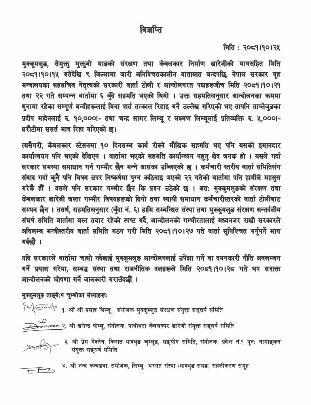 मुक्कुम्लुङ संरक्षण अन्तरदलीय सङ्घर्ष संघर्ष समितिका राष्ट्रिय मुक्ति पार्टीका अध्यक्ष राजेन्द्र महत्तो, संघीय लोकतान्त्रिक राष्ट्रीय मञ्चका अध्यक्ष कुमार लिङ्देन मिराक, पहिचानवादी मोर्चा संयोजक प्राध्यापक डाक्टर महेन्द्र लावती, जसपा नेपाल लिम्बुवान राष्ट्रिय समितिका मुख्य सचिव सञ्जय राई, जसपा सम्बद्ध किरात राष्ट्रिय समिति अध्यक्ष रमेश राई, प्रदेश नं १ नागरिक उन्मुक्ति पार्टी अध्यक्ष धनबहादुर खाम्दाक, नेपाल जनमुक्ती पार्टी उपाध्यक्ष भक्त खेवाङ, प्रदेश नं १ मंगोलनेशनल अर्गनाइजेसन डिजिजि अध्यक्ष नयन्द्र चाम्लिङ, किरात लिम्बुवा प्रदेश समिति नेपाल कम्युनिष्ट पार्टीका अध्यक्ष गजेन्द्र पालुङवाले हस्ताक्षर गरेको विज्ञप्तीमा वार्तामा भएको सहमतिलाई इमान्दारीका साथ कार्यान्वयन गर्नुपर्मा जोड दएका छन् ।