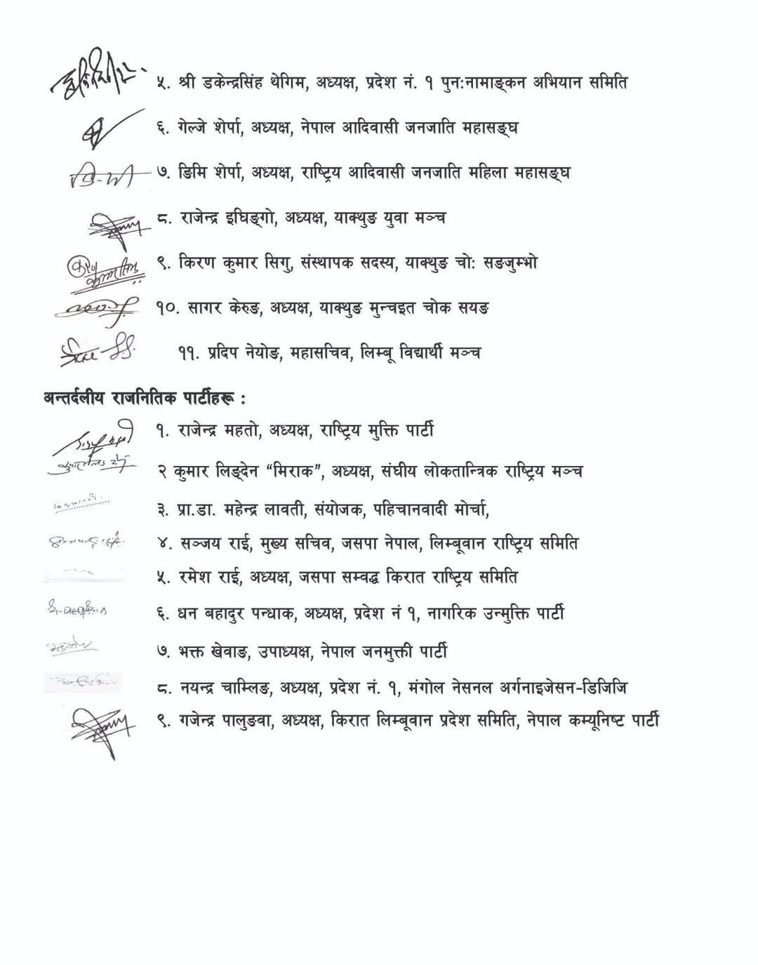 मुक्कुम्लुङ ताङ्सेप चुम्भोका मुक्कुमलुङ संरक्षण संयुक्त सङ्घर्ष समितिका संयोजक श्रीप्रसाद लिम्बू, पाथीभरा केबलकार खारेजी संयुक्त सङ्घर्ष समिति संयोजक खगेन्द्र फेम्बू, किरात याक्थुङ चुम्लुङ संघीय समिति अध्यक्ष तथा प्रदेश नं १ पुन: नामाङ्कन संयुक्त संघर्ष समिति संयोजक प्रेम येक्तेन, लिम्बु थरगत संस्था (याक्थुङ सयङ) सहजीकरण समूह संयोजक नन्द कन्दङवा, किरात धर्म तथा साहित्य उत्थान सङ्घ अध्यक्ष तथा प्रदेश नं १ पुन: नामाङ्न अभियान समिति संयोजक डकेन्द्रसिंह थेगिम, नेपाल आदिवासी जनजाति महासंघ अध्यक्ष गेल्जे शेर्पा, नेपाल आदिवासी जनजाति महिला महासंघ अध्यक्ष ङिमी शेर्पा, याक्थुङ युवा मञ्च अध्यक्ष राजेन्द्र इधिङ्गो, याक्थुङ चो सङजुम्भो संस्थापक सदस्य किरणकुमार सिगु, याक्थुङ मुञ्चइत चोक सयङ अध्यक्ष सागर केरुङ र लिम्बू विद्यार्थी मञ्च महासचिव प्रदिप नेयोङले हस्ताक्षर गरेका छन् ।