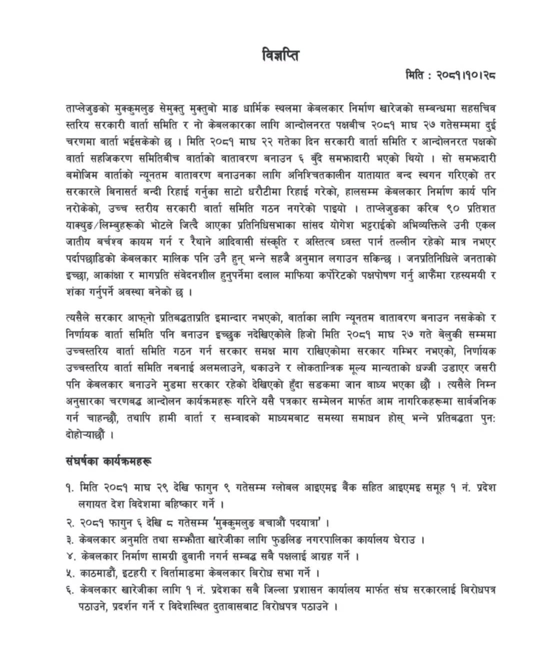विज्ञप्तीमा गएको माघ २२ गते सरकारी वार्ता टोली र आन्दलरत पक्षको वार्ता सहजिकरण समितिसँग भएको सहतिम कार्यान्वयन नगरी केबलकार निर्माण कार्य नरोकिएको, आन्दोलनकारीलाई बिना शर्त रिहाई गर्नुको साटो धरौटीमा रिहाई गरेको जनाइएको छ ।