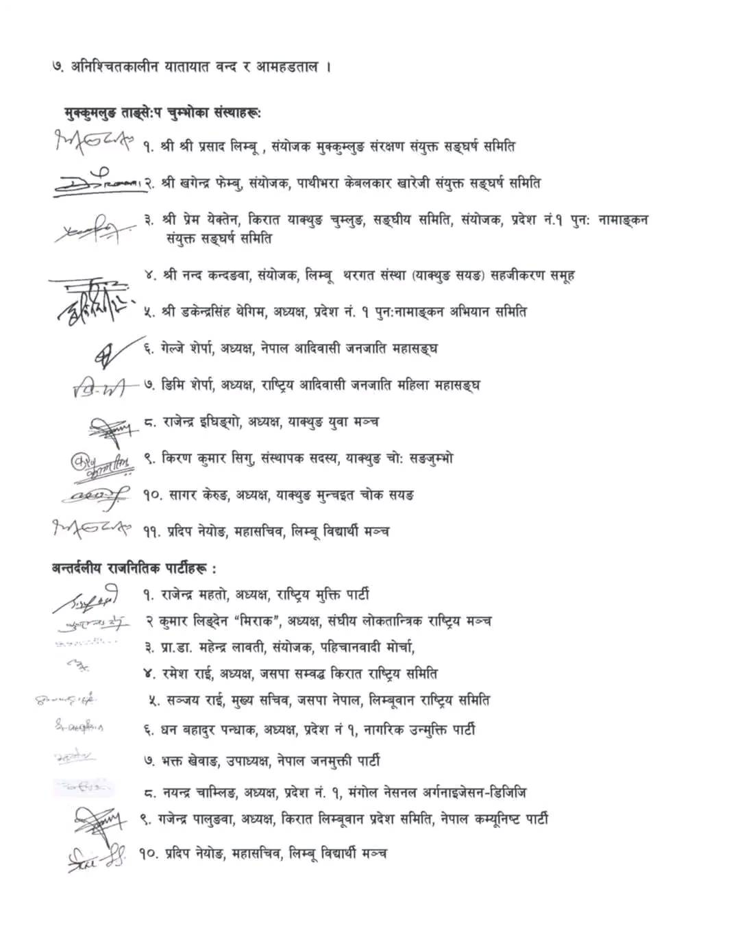 मुक्कुम्लुङ ताङ्सेप चुम्भोका मुक्कुमलुङ संरक्षण संयुक्त सङ्घर्ष समितिका संयोजक श्रीप्रसाद लिम्बू, पाथीभरा केबलकार खारेजी संयुक्त सङ्घर्ष समिति संयोजक खगेन्द्र फेम्बू, किरात याक्थुङ चुम्लुङ संघीय समिति अध्यक्ष तथा प्रदेश नं १ पुन: नामाङ्कन संयुक्त संघर्ष समिति संयोजक प्रेम येक्तेन, लिम्बु थरगत संस्था (याक्थुङ सयङ) सहजीकरण समूह संयोजक नन्द कन्दङवा, किरात धर्म तथा साहित्य उत्थान सङ्घ अध्यक्ष तथा प्रदेश नं १ पुन: नामाङ्न अभियान समिति संयोजक डकेन्द्रसिंह थेगिम, नेपाल आदिवासी जनजाति महासंघ अध्यक्ष गेल्जे शेर्पा, नेपाल आदिवासी जनजाति महिला महासंघ अध्यक्ष ङिमी शेर्पा, याक्थुङ युवा मञ्च अध्यक्ष राजेन्द्र इधिङ्गो, याक्थुङ चो सङजुम्भो संस्थापक सदस्य किरणकुमार सिगु, याक्थुङ मुञ्चइत चोक सयङ अध्यक्ष सागर केरुङ र लिम्बू विद्यार्थी मञ्च महासचिव प्रदिप नेयोङले हस्ताक्षर गरेका छन् ।