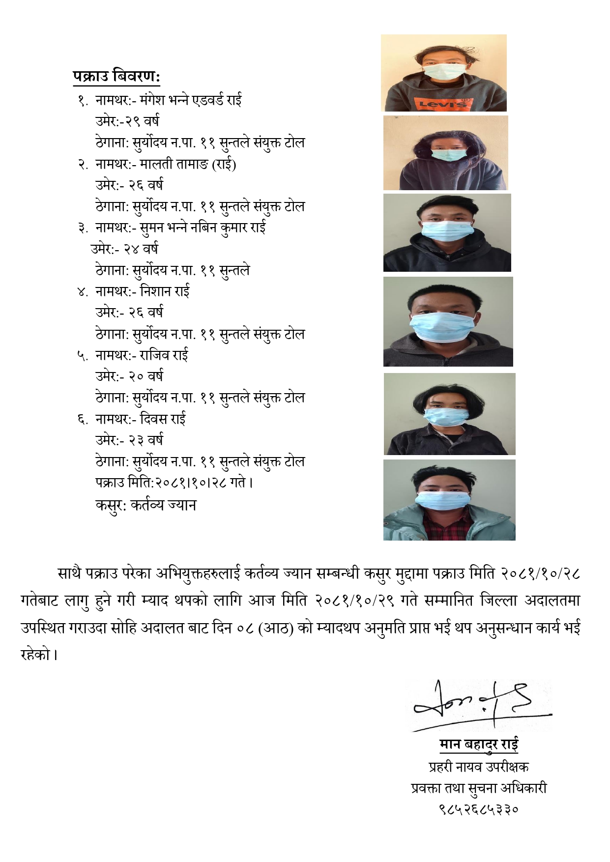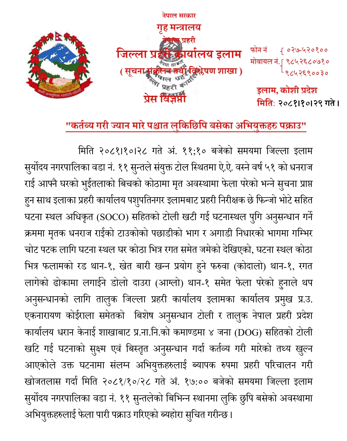 इलाम: जिल्ला प्रहरी कार्यालय इलामले हत्या आरोपमा मंगलबार ६ जनालाई पक्राउ गरेको छ ।