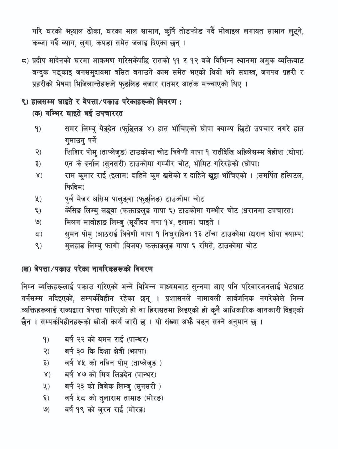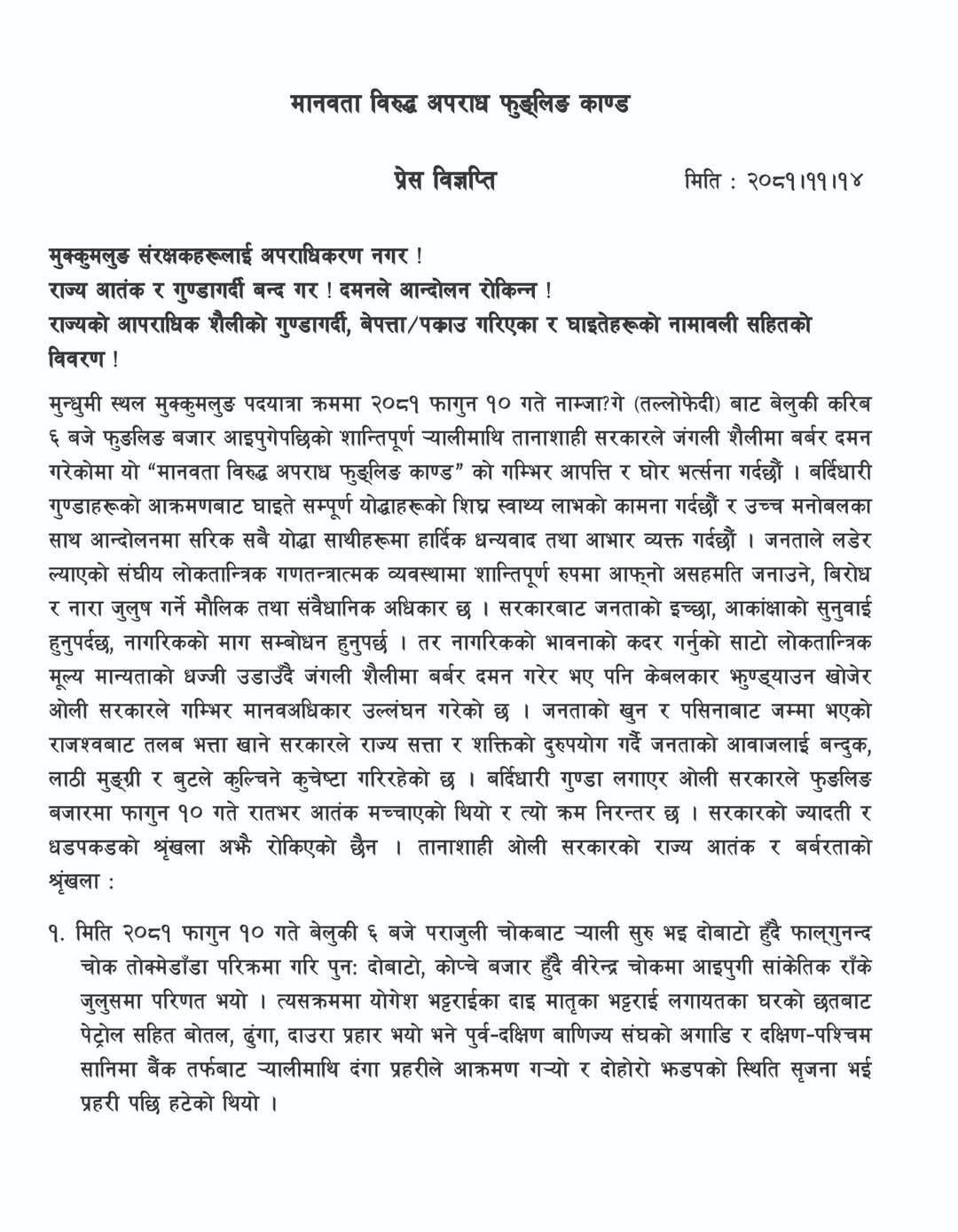 प्रदर्शनमा दोहोर झडपपछि तितरबितर भएका प्रदर्शनकारी होटलमा खाना तथा वासका लागि बसिरहेकालाई खोजीखोजी कुटपीट गर्नु । लछारपछार धरपकड गरी मरणासन्न हुने गरी कुटपीट गरी छाड्नु । घर भित्र बसेकालाई कोठा भित्र टियर ग्यास ल्याँकी यसबाट जोगिन बाहिर निस्कि भाग्नेलाई कुटपीट गर्नु मानवता विरोधी कार्य भएको विज्ञप्तीमा उल्लेख छ ।