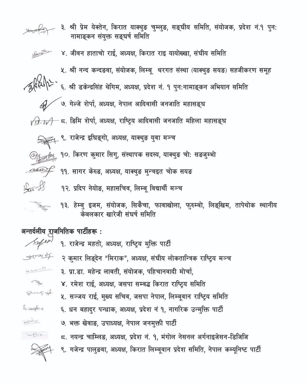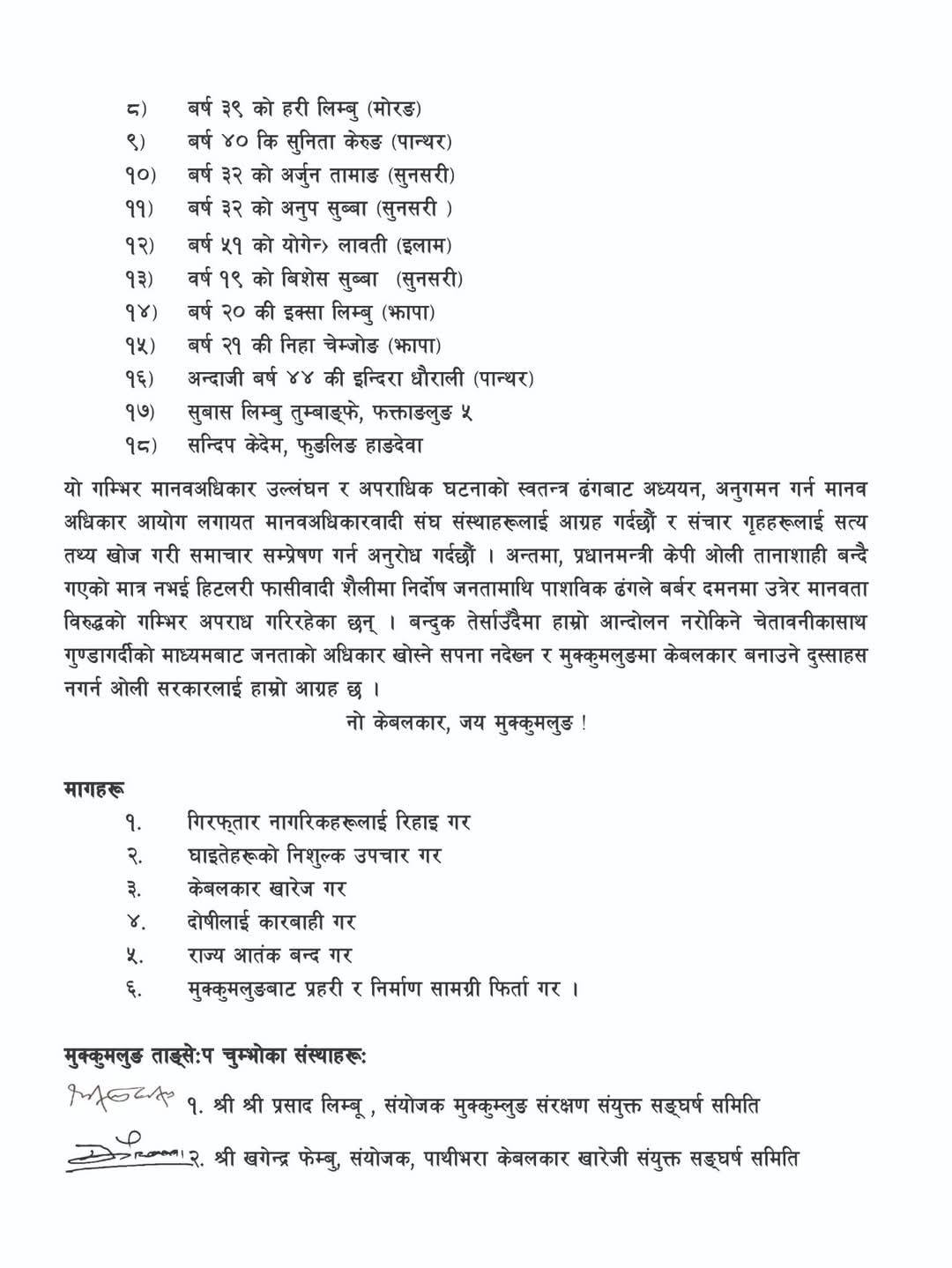 १३ विभिन्न संस्था र ९ अन्तर राजनीतिक दलका नेतृत्वले हस्ताक्षर गरेको विज्ञप्तीमा गिरफ्तार गरिएकाको रिहाई गर्नुपर्ने, घाइतेको निशुल्क उपचार हुनुपर्ने, केबलकार खारेज दोषीलाई कारबाही, राज्य आतांक बन्द गर्नु पर्ने र मुक्कुमलुङबाट प्रहरी र निर्माण सामग्री फिर्ता हुनुपर्ने माग गरेका छन् ।