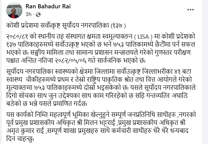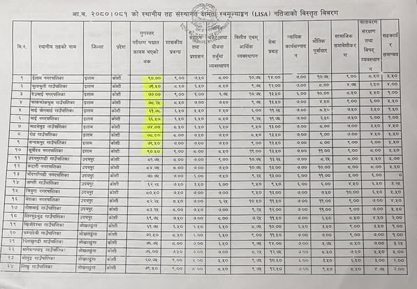 इलाम: इलामको सूर्योदय नगरपालिका स्थानीय तह संस्थागत क्षमता स्व:मूल्याङ्कन (एल,आइ,एस,ए (लिजा)मा प्रदेशकै उत्कृष्ट भएको छ ।