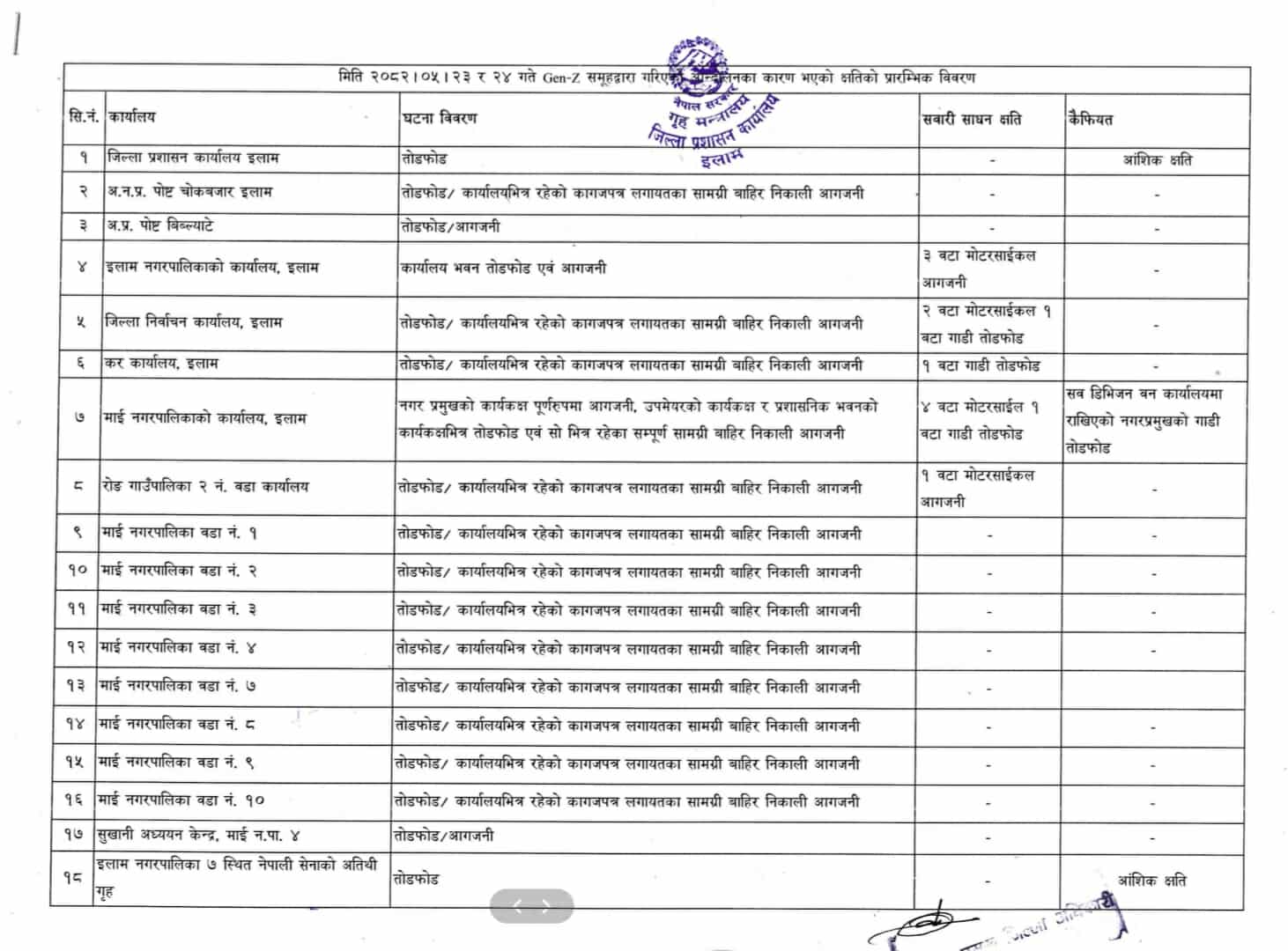 इलाम: जिल्ला प्रशासन कार्यालय इलामले जेन्जी आन्दोलनका क्रममा भएको क्षतिको प्रारम्भिक विवरण सार्वजनिक गरेको छ ।