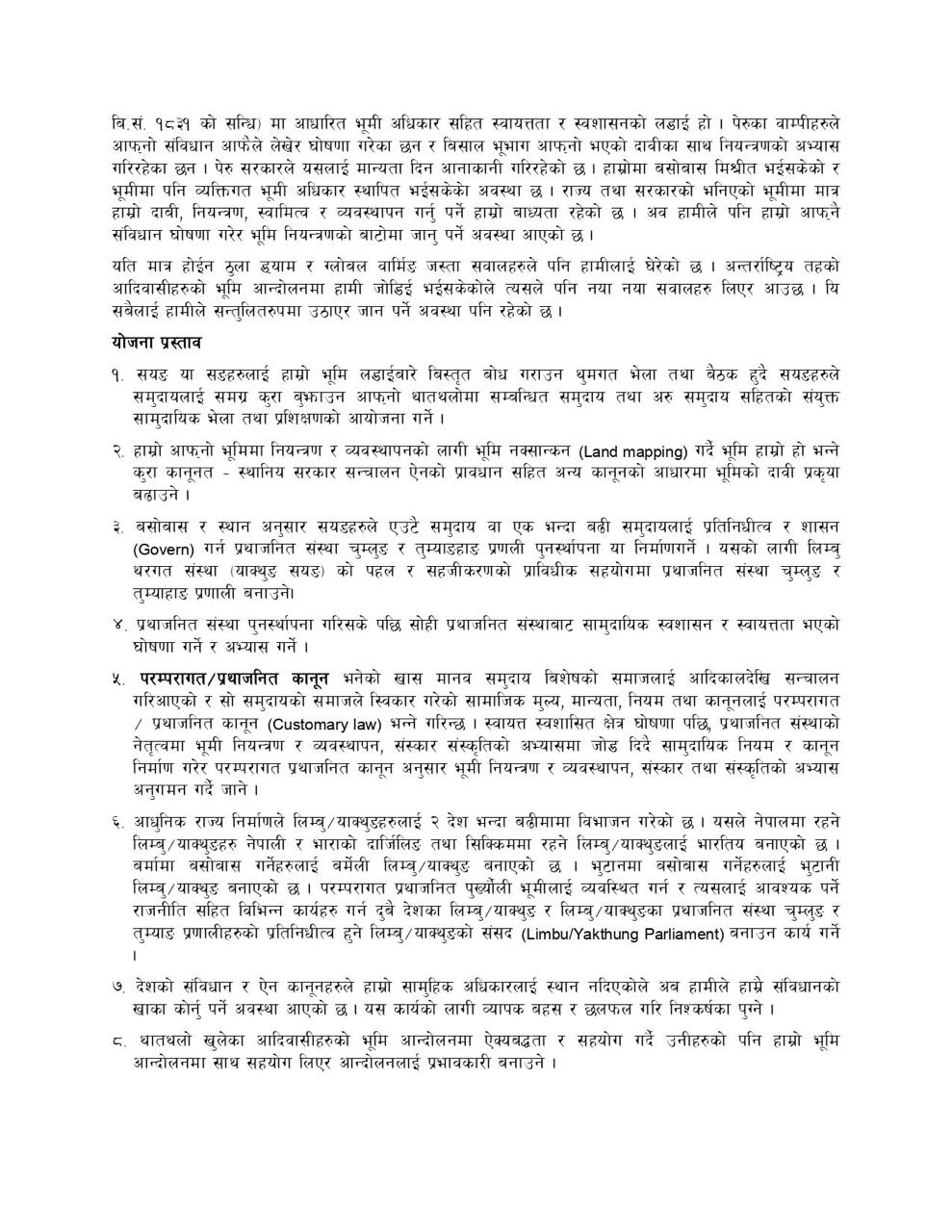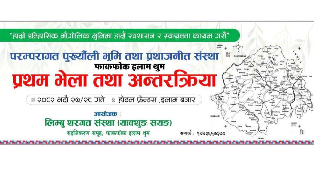 ‘हाम्रो ऐतिहासिक भौगोलिक भूमिकमा हाम्रै स्वशासन र स्वायत्तता कायम गरौं’ भन्ने मुला नारा बनाएको भेलामा परम्परागत पुरख्यौली भूमि र तथा प्रथाजनित संस्थाका विषयमा अन्तरक्रिया हुने संयोजक भूमिका फियाक लिम्बूले जानकारी गराइन् ।