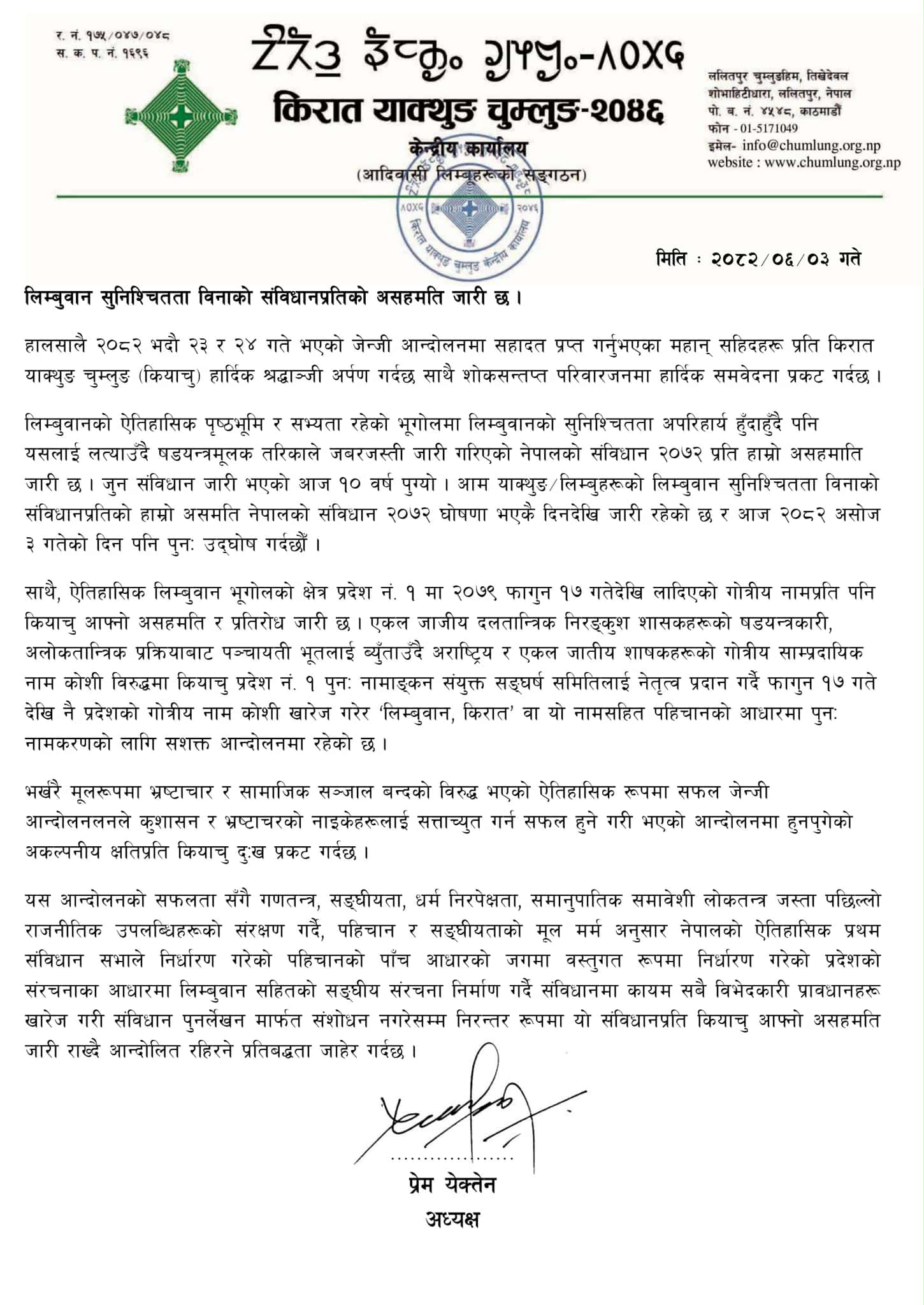 किरात याक्थुङ चुम्लुङ संघीय अध्यक्ष प्रेम येक्तेनले हस्ताक्षर गरेको विज्ञप्तीमा भनिएको छ ‘लिम्बुवानको ऐतिहासिक पृष्ठभूमि र सभ्यता रहेको भूगोलमा लिम्बुवानको सुनिश्चितता अपरिहार्य हुँदाहुँदै पनि यसलाई लत्याउँदै षडयन्त्रमूलक तरिकाले जबरजस्ती जारी गरिएको नेपालको संविधान २०७२ प्रति हाम्रो असहमाति जारी छ ।’