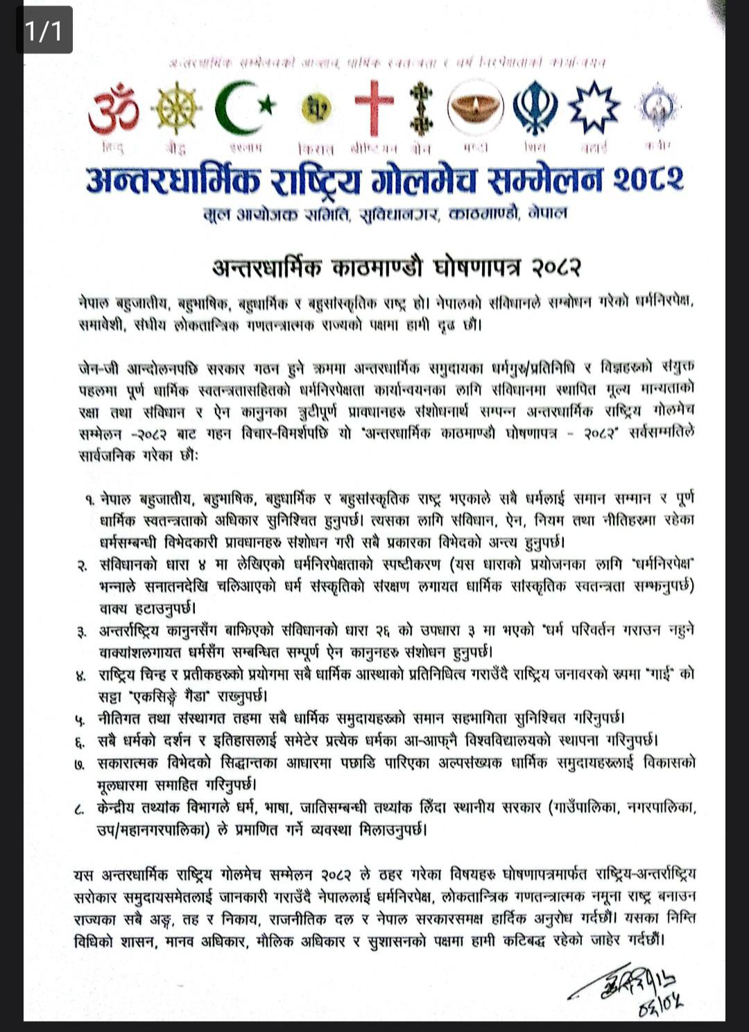 ८ बुँदे घोषणा पत्र जारी गर्दै आइतबार सकिएको सम्मेलनले सबै धार्मिक आस्थाको प्रतिनीधित्व गराउँदै राष्ट्रीय जनवारको रुपमा ‘गाई’को सट्टा ‘एकसिङ्गे गैडा’ राख्नु पर्छ भनेको छ ।