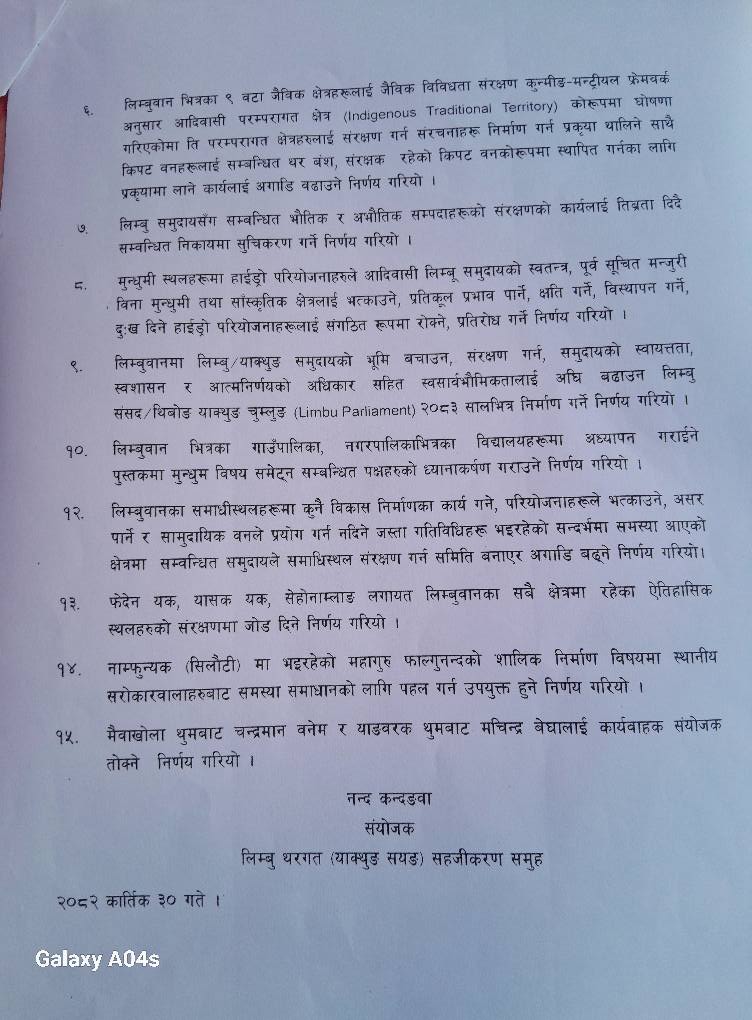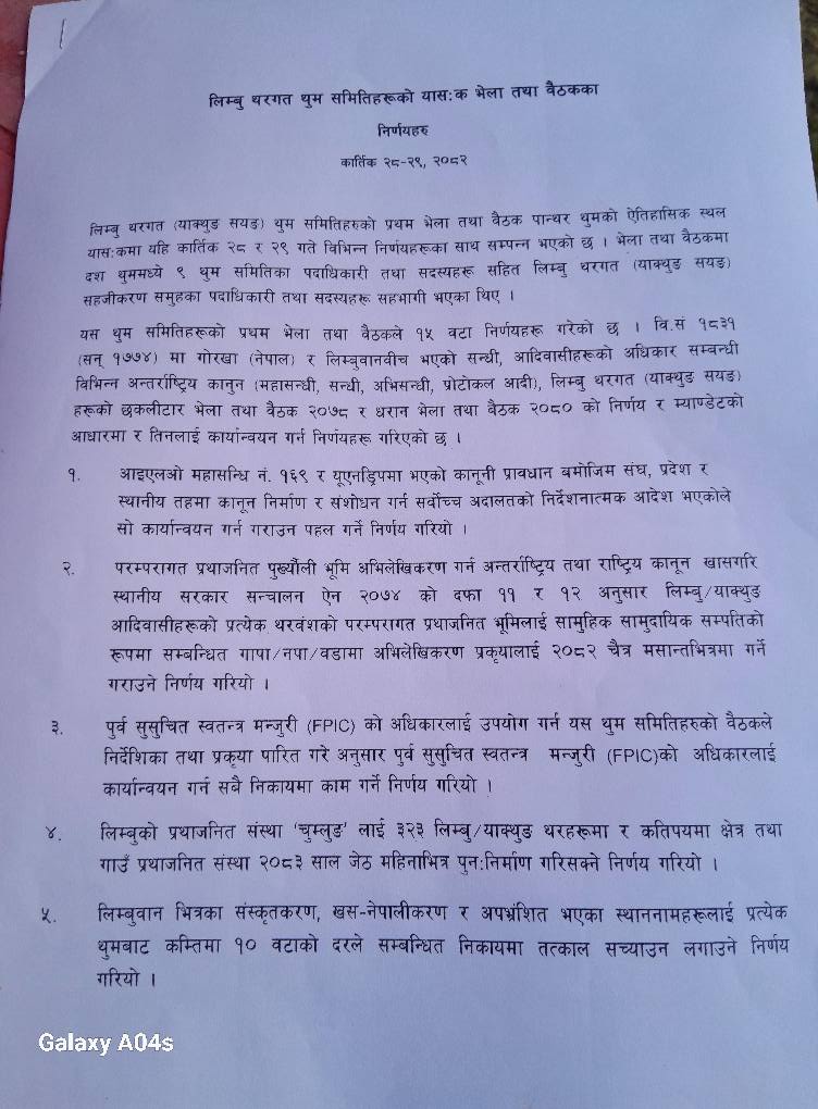 याक्थुङ समुदायको भूमि बचाउँन संरक्षण गर्न समुदायको स्वायत्तता स्वशासन र आत्मनिर्णको अधिकार सहित स्वासार्वभौमिकतालाई अघि बढाउन लिम्बू ससद (थिबोङ याक्थुङ चुम्लुङ) २०८३ सालभित्र निर्माण गर्ने । लिम्बुहरुको समाधिस्थल अतिक्रम रोक्न समिति बनाएर अघि बड्ने । स्थानीय पालिकामा याक्थुङ मुन्धुम बमोजिमको पढन पाढन गराउँन ध्यानाकर्षण गराउँने लगायतको निर्णय सार्वजनिक गरेको गरेको छ ।