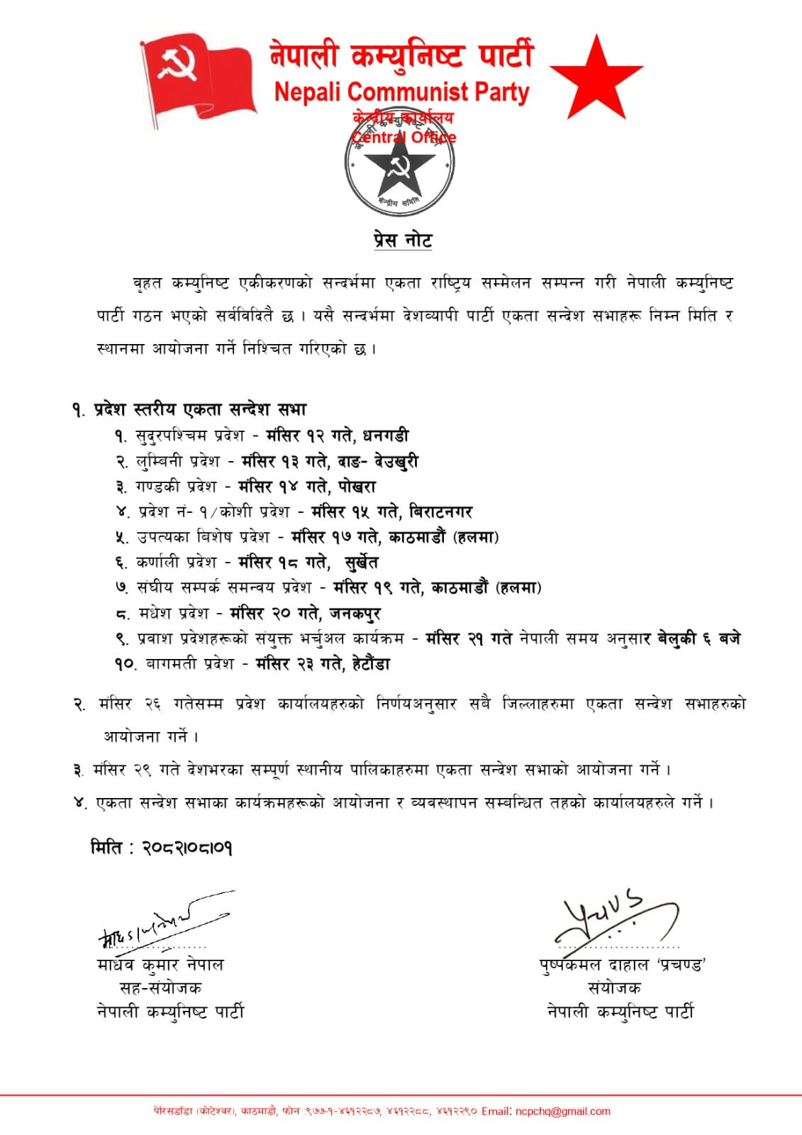 साथै कर्णालीको सुर्खेतमा मंसिर १८ गते, मधेसको जनकपुरमा मंसिर २० गते र बागमतीको हेटौंडामा मंसिर २३ गते सभा हुने मंसिर १ गते पार्टी संयोजक पुष्पकलम दाहाल प्रचण्ड र सहसंयोजक माधवकुमार नेपालले हस्ताक्षर गरेको प्रेस नोटमा उल्लेख छ ।