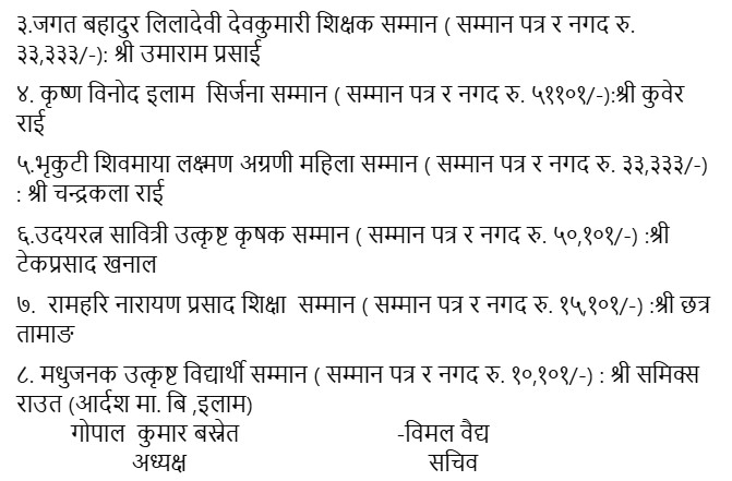 यस्तै उदयरत्न सावित्री उत्कृष्ट कृषक सम्मान नगद ५० हजार एक सय एकले एक टेकप्रसाद खनाल, रामहरी नारायण प्रसाद शिक्षा सम्मान नगद १५ हजार एक सय एकले छत्र तामाङ र मधुजनक उत्कृष्ट विद्यार्थी सम्मान नगद १० हजार एक सय एकसहित आदर्श माध्यमिक विद्यालयका विद्यार्थी समिक्स राउत प्रदान गरिने जनाइएको छ ।