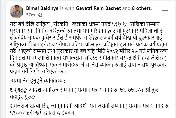 इलाम: जयनेपाल प्रतिभा प्रोत्साहन प्रतिष्ठान इलामले ३ लाख बढी नगद सहित ८ व्यक्तित्वलाई सम्मान गर्ने भएको छ ।