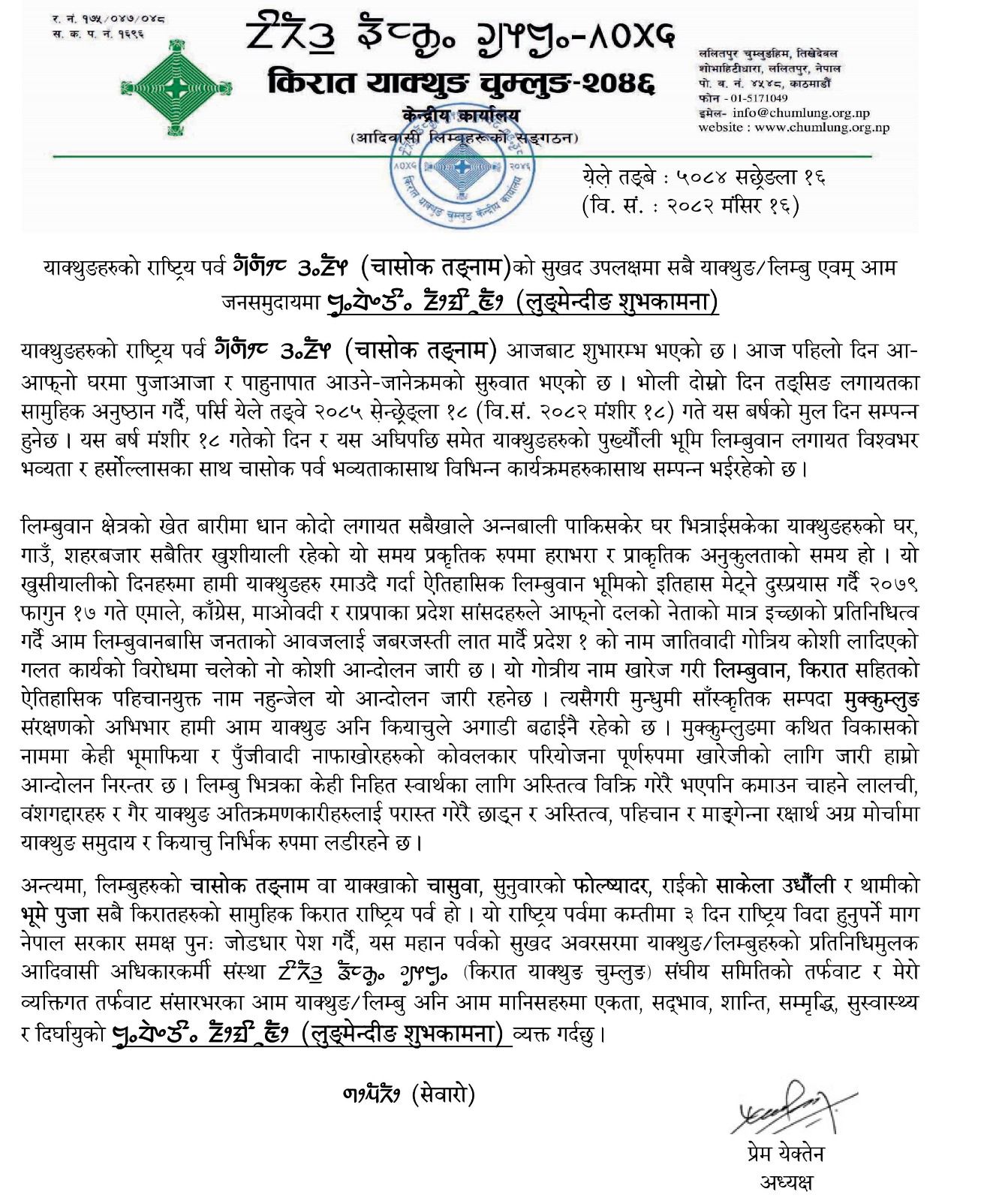 शुभकामना सन्देशमा मुन्धुमी सांस्कृतिक सम्पदा मुक्कुमलुङ संरक्षणको अभिभारा हामी आम याक्थुङ अनि कियाचुले बढाइने रहेको छ । मुक्कुमलुङ कथित विकासको नाममा केही भूमाफिया र पूँजिवादी नाफाखोरहरुको केबलकार परियोजना पूर्ण रुपमा खारेजीका लागि जारी हाम्रो आन्दोलन निरन्तर छ । लिम्बु भित्रका केही निहित स्वार्थका लागि अस्तित्व बिक्री गरेरै भएपनि कमाउन चाहने लालची बंशगद्दारहरु र गैर याक्थुङ अतिक्रमणकारीहरुलाई परास्त गरेरै छाड्न र अस्तित्व पहिचान र माङ्गेन्ना रक्षार्थ अग्र मोर्चामा याक्थुङ समदाय र कियाचु निर्भिक रुपमा लडिरहने बताइएको छ ।