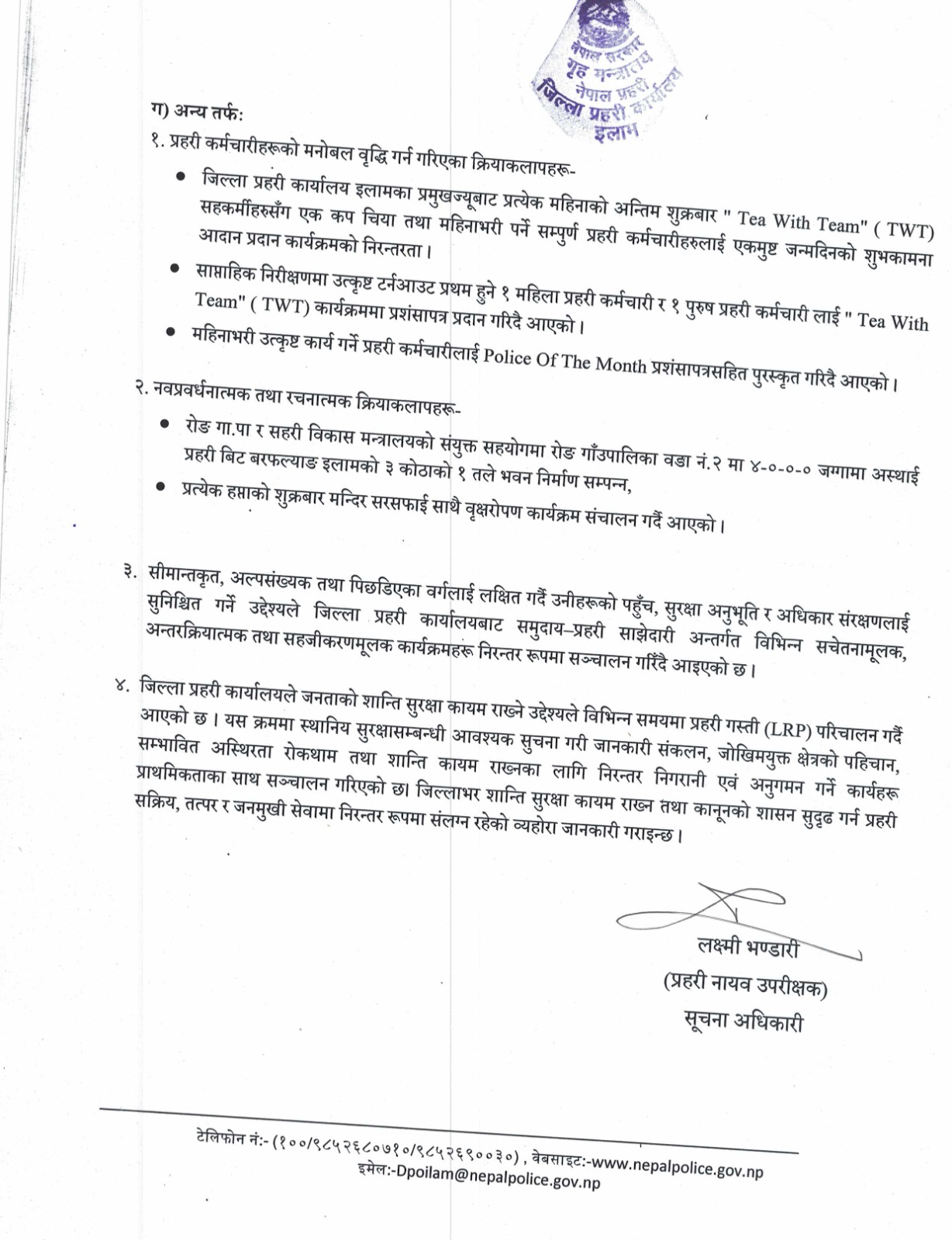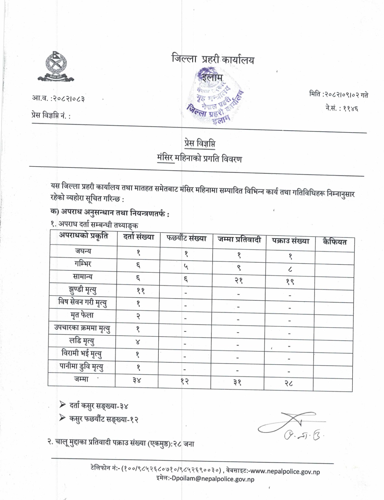 प्रगती बिवरणमा ३४ घटना कार्यालयमा दर्ता भएको छ । १२ वटा कसुरको फर्स्यौट भएको छ । मंसिर महिनामा चालु मुद्दाका २८ आरोपी पक्राउ परेको उल्लेख छ ।