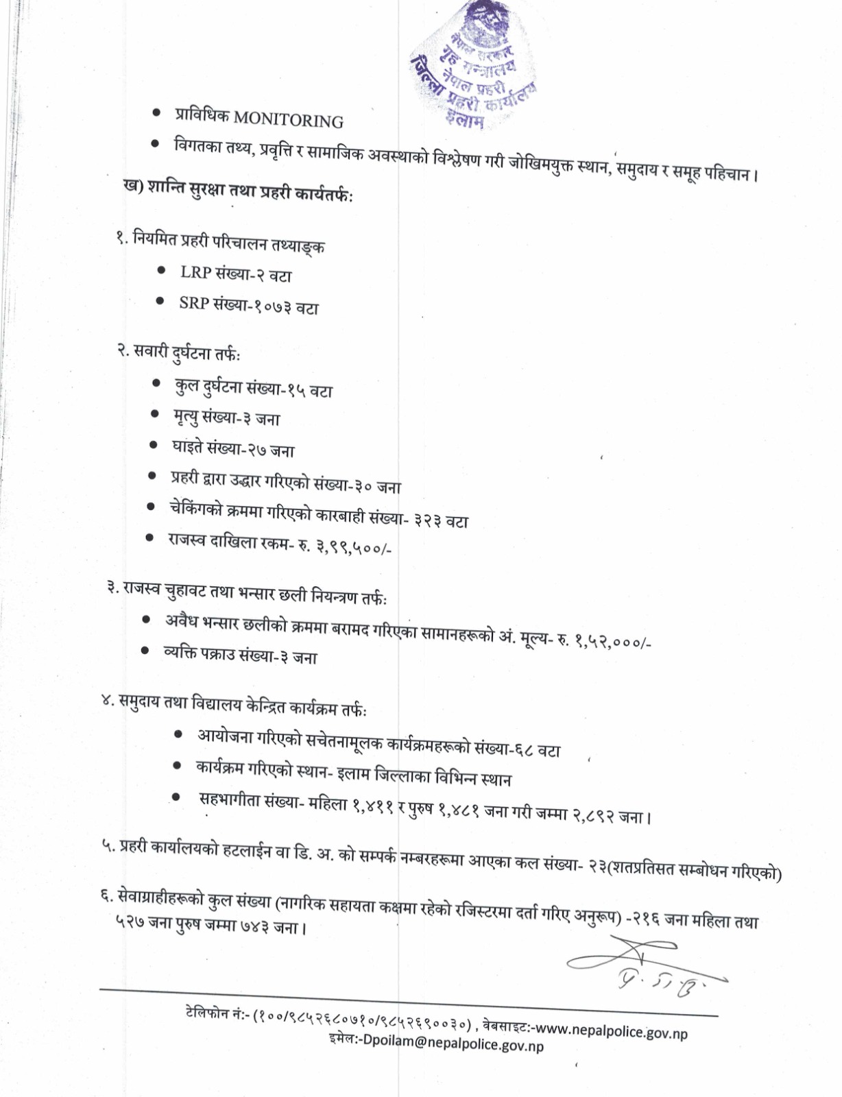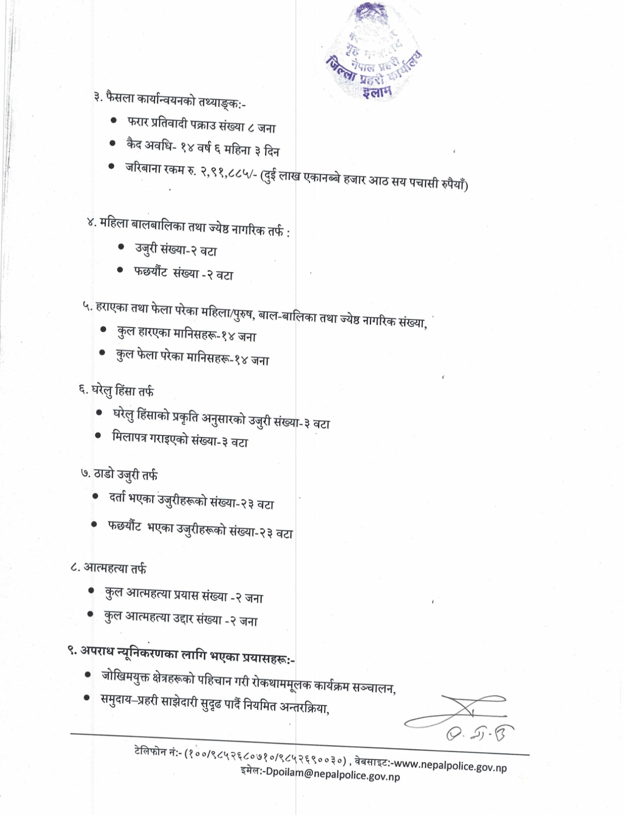 हराएका फेला परेका महिला पुरुष बाल बालिका तथा जेष्ठ नागरिकको संख्या १४ रहेको छ । तीन वटा घरेलु हिंसाको घटना भएको तथ्याङ्क छ । २३ वटा ठाडो उजुरी परेको थियो भने २ वटा आत्महत्याको प्रयासमा उद्दार समेत गरेको उल्लेख छ ।