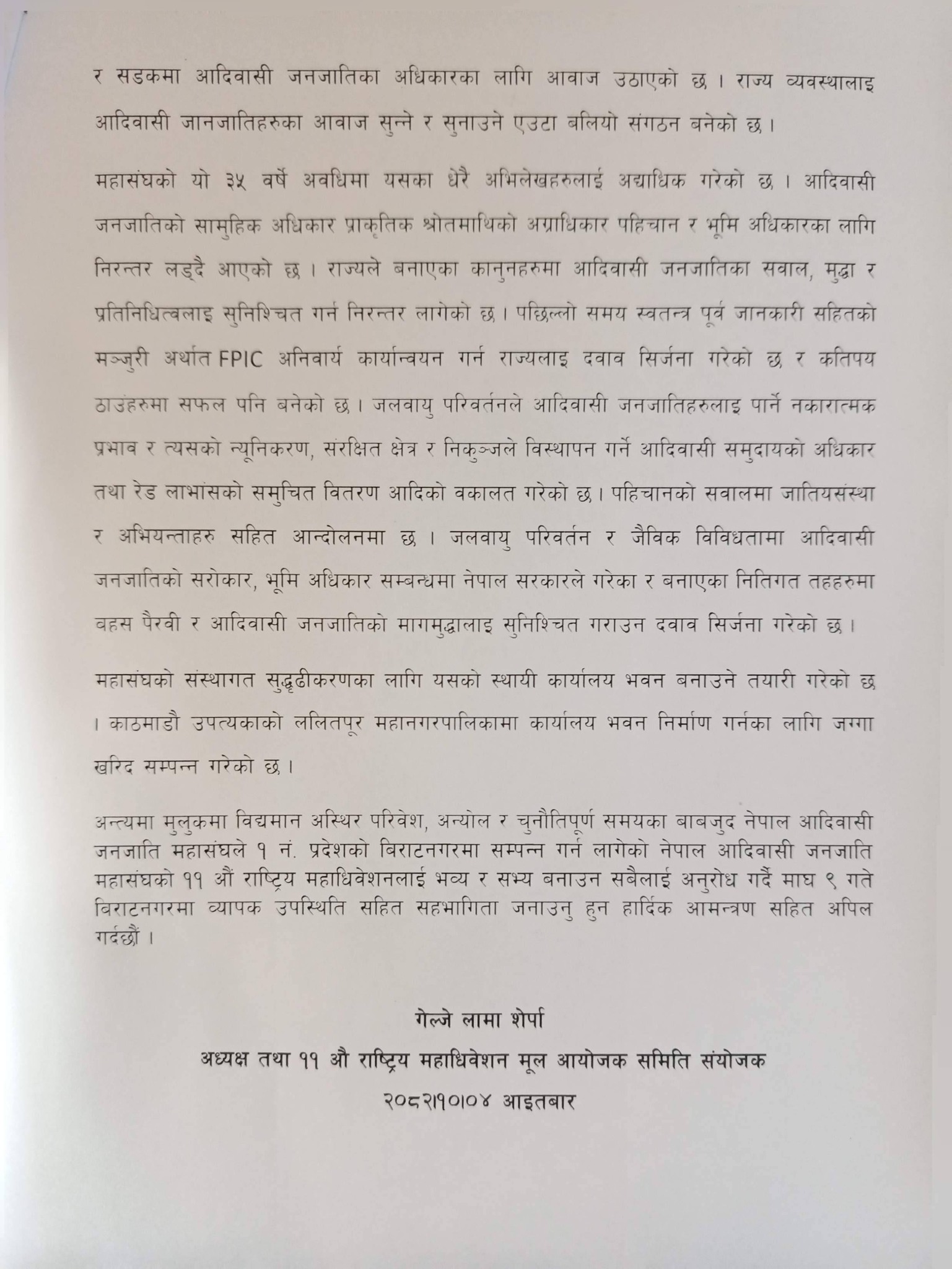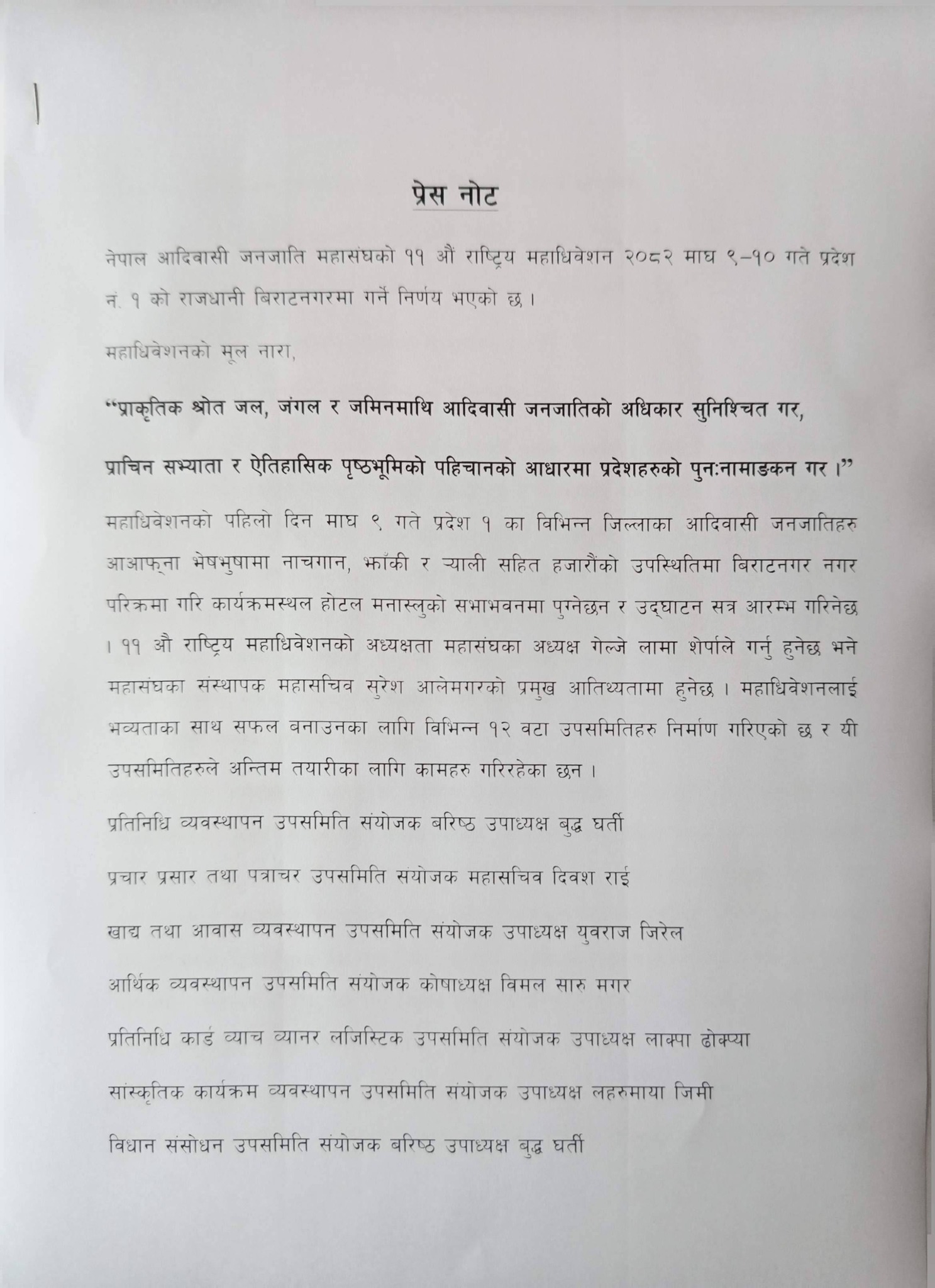 ‘प्राकृतिक स्रोत जल, जंगल र जमिनमाथि आदिवासी जनजातिहरुको अधिकार सुनिश्चित गर, प्राचिन सभ्यता र ऐतिहासिक पृष्ठभूमीको पहिचानको आधारमा प्रदेशहरुको पुन:नामाङ्कन गर’ भन्ने मुल नाराको साथमा प्रदेश १ को राजधानी बिराटनगर महाधिवेसन गर्न लागेको महासंघले आइतबार पत्रकार सम्मेलन गरी जानकारी गराएको हो ।