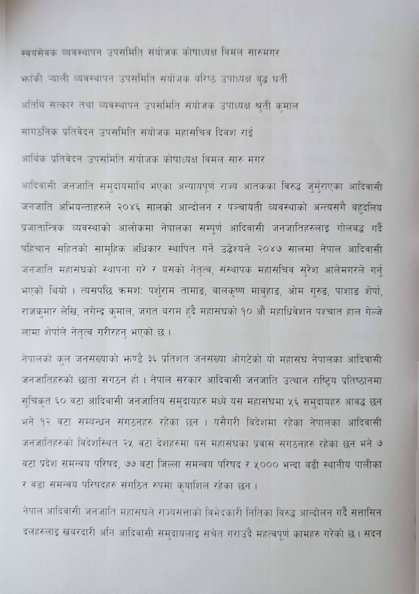 खाद्य तथा आवास व्यस्थापन उपसमिति संयोजक उपाध्यक्ष युवराज जिरेल, आर्थिक व्यवस्थापन, स्वयंसेवक तथा आर्थिक प्रतिवेदन संयोजक कोषाध्यक्ष बिमल सारु मगर, प्रतिनिधी कार्ड व्याज व्यानर लजिष्टिक संयोजकमा उपाध्यक्ष लाक्पा ढोक्प्या, सांस्कृतिक कार्यक्रम व्यवस्थापन उपाध्यक्ष लहरुमाया जिमी र अतिथी सत्कार संयोजक श्रुति कुमाल संयोजक तोकिएको छ ।