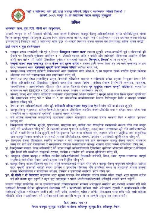 अपिल पत्रमा भनेको छ ‘प्रतिनिधि सभा सदस्य निर्वाचनमा किरात याक्थुङ चुम्लुङले उठाएका अजेन्डाहरूमा सहमत, अडान लिने र कार्यान्वयन गराउन इमान्दार रूपमा कटिवद्ध उम्मेदवारलाई जिताउन पार्टी र जातिभन्दा माथि उठेर आ–आफ्नो निर्वाचन क्षेत्रमा मतदान गर्न कियाचुबाट हार्दिक अपिल गर्दछौँ ।’