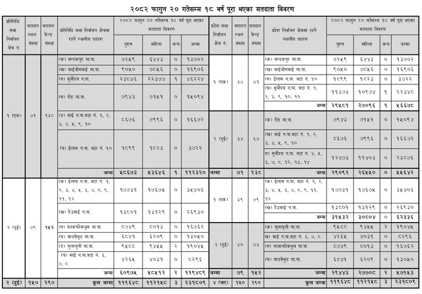 यसमा सदकपुर गाउँपालिकाको १३ हजार ७ सय २, माईजोगमाई गाउँपालिकाको १६ हजार ९ सय ६, रोङ गाउँपालिकाको १५ हजार ९४, सूर्योदय नगरपालिकाको एक अन्य सहित ४६ हजार २ सय २४ मतदाता रहेका छन् । माई नगरपालिकाको वडा नंम्बर. १, २, ३, ४, ५, ९, १० का १६ हजार ६ सय ७२ जना र इलाम नगरपालिका १० नम्बर वडाका ३ हजार ७ सय २२ जना मतदाता छन् ।