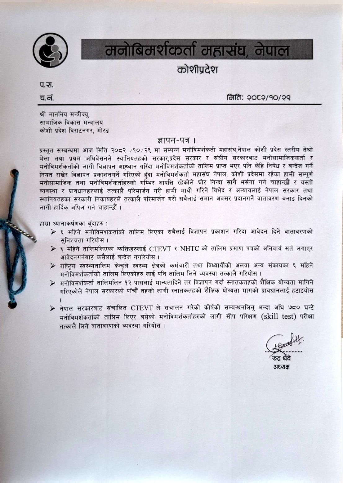 ज्ञापन पत्रभनिएको छ ‘स्थानीय सरकार प्रदेश तथा संघीय सरकारबाट मनोसामाजिकर्ता र मनोबिमर्शकर्ताको लागि विज्ञापन आव्हान गरिदा मनोबिमर्शकर्ताको तालिम प्राप्त भएर पनि केही निशेध गर बन्देज गर्ने नियत राखेर विज्ञापन प्रकाशन गर्ने गरेकोमा यस्तो व्यवस्था र प्रावधानहरुलाई तत्कालै परिमार्जन गरी मनोबिमर्शमाथि गरिने विभेद र अन्यायलाई नेपाल सरकार तथा स्थानीय तहका सरकारी निकायहरुले तत्कालै परिमार्जन गरी सबैलाई समान अवसर प्रदान गर्ने बातावरण बनाई दिन अपिल गर्दछौं ।’