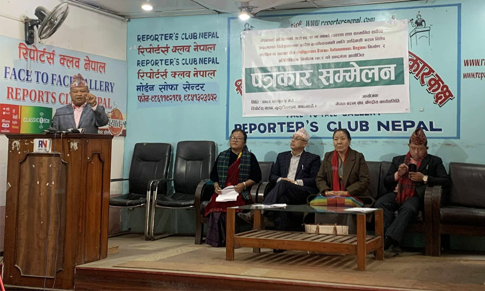 मंगलबार काठमाडौंमा पत्रकार सम्मेलन गर्दै संघले गोरखा जिल्लाको क्षेत्र नम्बर १ र २ का सबै दलले बराम जातिको थातथलोलाई समेटेर सर्वोेच्चले दिएको आदेश कार्यान्वयन गर्ने प्रतिवद्धता जनाए मात्र मत दिने घोषणा गरे ।