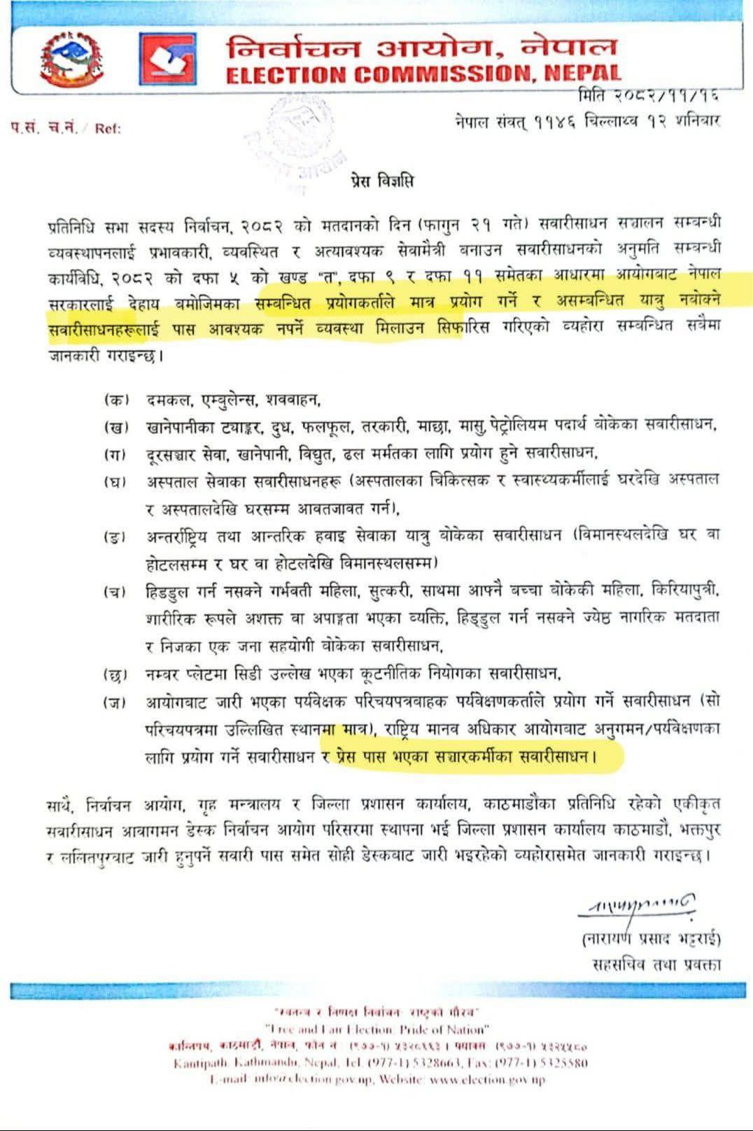 प्रतिनिधि सभा सदस्य निर्वाचन, २०८२ को मतदानको दिन (फागुन २१ गते) सवारीसाधन सञ्चालन सम्बन्धी व्यवस्थापनलाई प्रभावकारी, व्यवस्थित र अत्यावश्यक सेवामैत्री बनाउन सवारीसाधनको अनुमति सम्बन्धी कार्यविधि, २०८२ को दफा ५ को खण्ड “त”, दफा ९ र दफा ११ समेतका आधारमा आयोगबाट नेपाल सरकारलाई देहाय बमोजिमका सम्बन्धित प्रयोगकर्ताले मात्र प्रयोग गर्ने र असम्बन्धित यात्रु नबोक्ने सवारीसाधनहरूलाई पास आवश्यक नपर्ने व्यवस्था मिलाउन सिफारिस गरिएको व्यहोरा सम्बन्धित सबैमा जानकारी गराइन्छ।