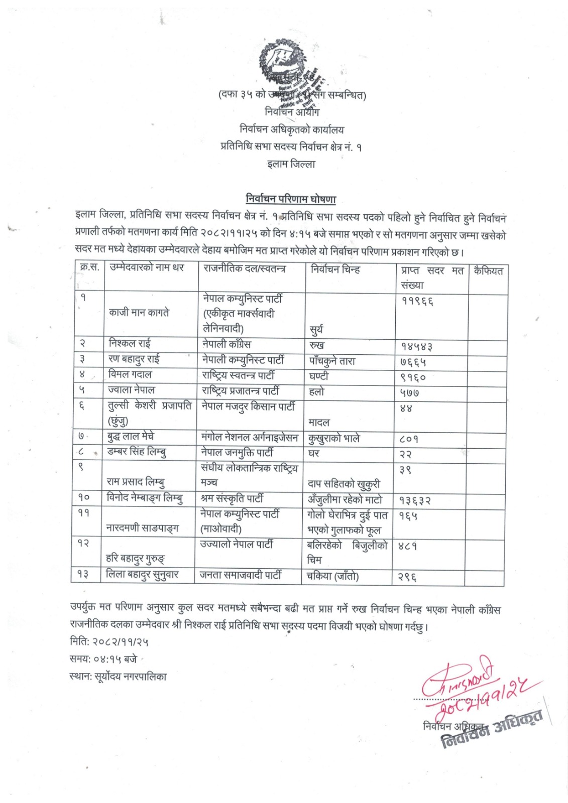 इलाम: इलाम १ को प्रत्यक्ष तर्फको अन्तिम मत परिणाम बरखरै सार्वजनिक भएको छ । मत परिणाम अनुसार इलाम क्षेत्र नं १ मा नेपाली कांग्रेसका निश्कल राई निर्वाचित भएका छन् ।