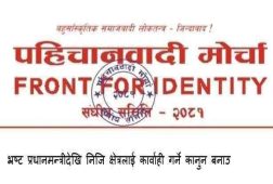 इलाम: पहिचानवादी मोर्चाले भ्रष्ट प्रधानमन्त्रीदेखि निजि क्षेत्रलाई कारबाही गर्ने कानुन बनाउन माग गरेको छ । मोर्चाले बुधबार विज्ञप्ती जारी गर्दै भ्रष्टचारको अन्त्य बिनाको नेपालको उन्नती र प्रगतिको कल्पना गर्न नसकिने जनाएको छ । नेपालको प्रगति र उन्नति हुन नसक्नु विगतदेखि वर्तमानसम्म देशको सम्पूर्ण शासनयन्त्र...