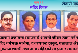 इलाम: आज सहिद दिवस देशभर विभिन्न कार्यक्रम गर्दै मनाइँदैछ । देश र जनताको हितका लागि आफ्नो जीवन बलिदान गर्ने सहिदको स्मरण गर्दै दिवस मनाउने गरिएको छ । नेपालमा प्रजातन्त्र स्थापनार्थ आफ्नो जीवन त्याग गर्ने चार सहिद धर्मभक्त माथेमा, दशरथचन्द्र ठाकुर, गङ्गालाल श्रेष्ठ र शुक्रराज शास्त्री तथा अन्य सहिदको सम्झनामा यो ...